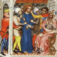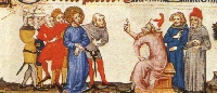 Soldiers present Christ to Annas, from The Tres Belles Heures of Jean De Berry, Late 14th century. Note the dagged hem lines and hood of same color as cote. Dagger worn through pouch. |