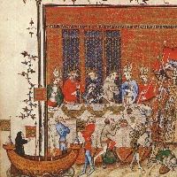 Knights and Soldiers reenacting the conquest of Jerusalem as feast entertainment from The Grandes Chroniques de France, painted shortly after 1378. |