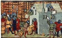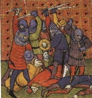 Soldiers killing peasants. Late 14th century. From Ms Roy C VII in the British Museum.