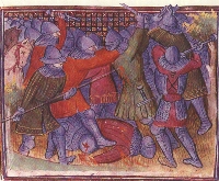 Soldiers fighting at the battle of Poitiers. Late 14th century. From Chroniques de Froissart, (MS Fr.2643) in the Biblioteque Nationale, Paris |