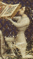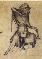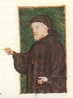 Geoffrey Chaucer as painted by Thomas Hoccleve circa 1400 Note the paternoster in his hand and the knife suspended on his chest. Nice folds in gown and bagpipe sleeves. |