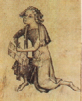A Messenger retrieving a letter from his hood. Paris, circa 1400 from a pen and ink drawing in the Staatliche Museen Preussischer Kulturbesitz, Kupferstichkabinett, Berlin Note the hood draped on the shoulders and dagger worn through the pouch |