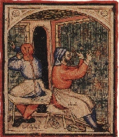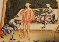 Two tailors and their customer fitting woolen clothes. from The Tacuinum Sanitas of Casacatsnse, Late 14th century. Note the table and bench. Extremely short gown. |