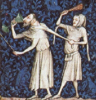 A man about to beat another from The Psalter of Bonne de Luxembourg , Mid 14th century. Note the pouch and hanging sleeves.. One man holds a whisk broom and the other a glass goblet. . |