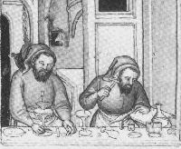 Bankers from Additional MS 27695, Northern Italy, Late 14th century Note the 3 lock chest and table. Shoulder buttoning cloak and a variety of headgear. |