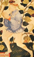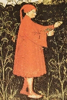 A man with a hawk from The Tacuinum Sanitas of Paris, Late 14th century. Note the elaborately dagged gown possibly lined with fur. Long pointed hose/shoes. |