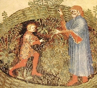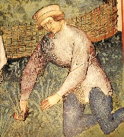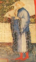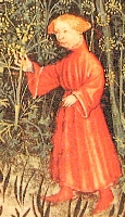 A man harvesting fennel from The Tacuinum Sanitas of Casacatsnse, Late 14th century. Note the long pointed hat. matching hat, hose and gown. |