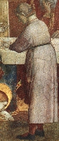 A Servant serving at table from Supper in the House of the Pharisee by Giotto, Early 14th century Note the seams on the translucent coif and the length of the belt. Long chord on tasseled pouch. |