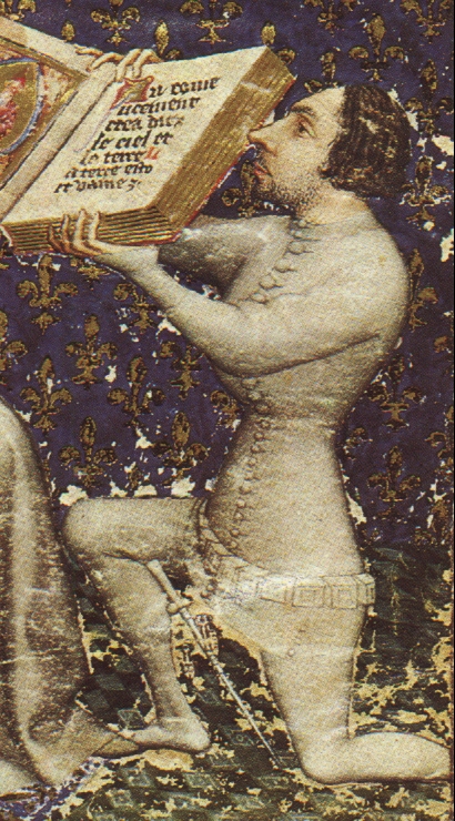 Jean de Vaudetar presents his book to King Charles V of France from The Bible Historiale of Jean de Vaudetar, 1371 Note the padded chest and differently sized buttons above and below the waist. Buttoned slits at hips and small buttons at collar. Sleeves extend onto hands. |
