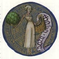Two men and a woman working in the fields from The Tacuinum Sanitas of Vienna, Late 14th century. Note the man's straw hat .They are dressed in underclothes. Interesting outfit decorated with wheat. |