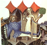 Men and women in underwear in the fountain of youth. from a fresco, circa 1411, in the great hall of the Castello di Manta. |