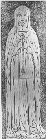 Effigy of a Merchant's Wife at Parish Church of St. Peter and Paul, Northleach, Gloucesterchire. Late 14th century. Note the open buttoned neckline. Rings on fingers at upper knuckles. Tasseled chord closes the cloak. Sleeves extend well onto hands. |