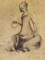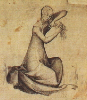 A woman combing her hair. Paris, circa 1400 from a pen and ink drawing in the Staatliche Museen Preussischer Kulturbesitz, Kupferstichkabinett, Berlin Note the braid and the cut of the neckline. |