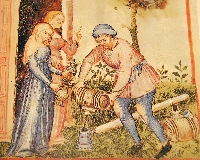 A man and woman with pine cones from The Tacuinum Sanitas of Paris, Late 14th century. Note the double sleeves and wide neckline |