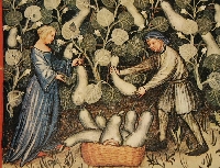 A man and woman picking squash from The Tacuinum Sanitas of Vienna, Late 14th century. Note the hair style. Wide sleeves and neckline. Long pointed shoes. |