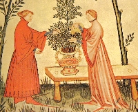 A man and woman examining a marjoram plant from The Tacuinum Sanitas of Vienna, Late 14th century. Note the long shoes and hairstyle. High Neck and wide sleeves. Watering pitcher. |