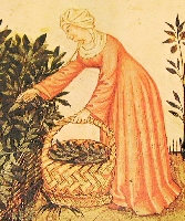 A woman gathering sage. from The Tacuinum Sanitas of Casacatsnse, Late 14th century. Note the turban head dress and the basket.