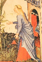 A woman picking roses from The Tacuinum Sanitas of Paris, Late 14th century. Note the elaborately decorated (embroidered?) cuffs Blue underdress revealed at hem. Red bead necklace. |