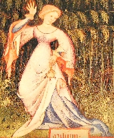 A woman in a millet field from The Tacuinum Sanitas of Paris, Late 14th century. Note the flared underdress or chemise cuffs revealed. Tasseled pouch and wide overdress sleeves. |