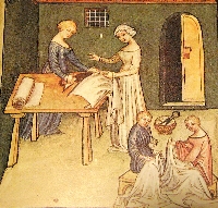 Two Women buying olive oil from The Tacuinum Sanitas of Vienna, Late 14th century. Note the hairstyle and veil. |