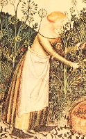 A woman picking dill from The Tacuinum Sanitas of Vienna, Late 14th century. Note the apron and bust revealing neckline.